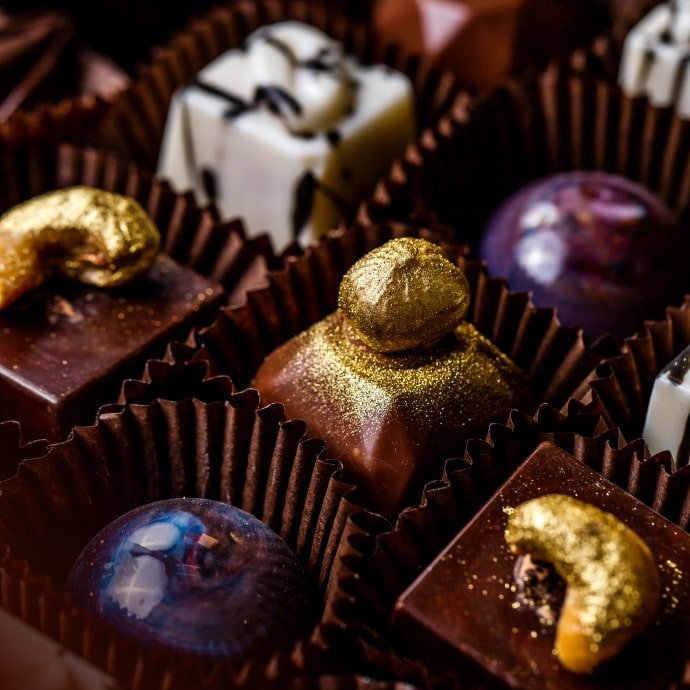 Ingredients: sugar, cocoa butter, cocoa paste, butter (milk), almonds, glucose, whole milk powder, hazelnuts, vegetable oils (palm kernel, palm, rapeseed), humectant (E420, E1103), skimmed milk powder, lactose, clarified butter (milk), cream (milk), honey, pistachios, yuzu purée, emulsifier (soya lecithin, sunflower lecithin), Marc de Champagne, whey, coffee, maltodextrin, glucose syrup, natural flavour, cocoa powder, flavouring, natural flavouring substances, cocoa powder low-fat, egg white powder, coating agent (E904), barley malt, spirulinaextract, kirsch, salt, colouring (E100), thickening agent (E414).